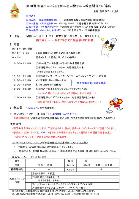 募集を開始いたします、楽しいテニス新年をお迎えください